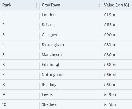 Glasgow, which has witnessed one of the largest growth rates of all UK cities in the past year, follows in third place with a property market value of £90.75bn, significantly higher than the total value of Scotland’s capital Edinburgh, which comes sixth on the list with a total house market value of £68.27bn.
