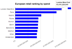 London’s West End ranks top of European towns and cities by retail spend, followed by Paris, Madrid, Rome, Munich, Berlin.